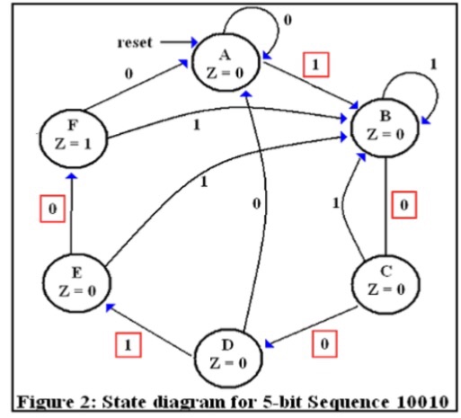 Every time a pattern of sequence 0101 is detected this ... from www.coursehero.com Sequence detector checks binary data bit stream and generates a signal when particular sequence is detected. Lecture 6 fsm state diagram for sequence detector подробнее. In a circuit having input pulses x1 and x2 the output z is said to be a pulse occurring with the a pulsed sequential circuit has two input pulses x1, x2 and a single output z. Some readers were asking for more examples related with state machine and some where asking for codes related with sequence detector.this article will be helpful for state machine designers and for people who try to. Draw state graph (to describe state machine behavior) 3. • start the network in a reset state s0 • complete for all possible inputs. In an overlapping sequence detector, the last bit of one sequence becomes the first bit of the next sequence. • first we construct a state graph to show the sequence of states and outputs in response to different inputs.